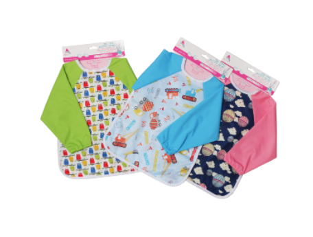 - יתרונות: בד אטום לנוזלים המעניק כיסוי מלא גם לזרועות. כולל כיס מתקפל בתחתית ללכידת פירורים ונזילות לפני שהם מגיעים לרצפה.